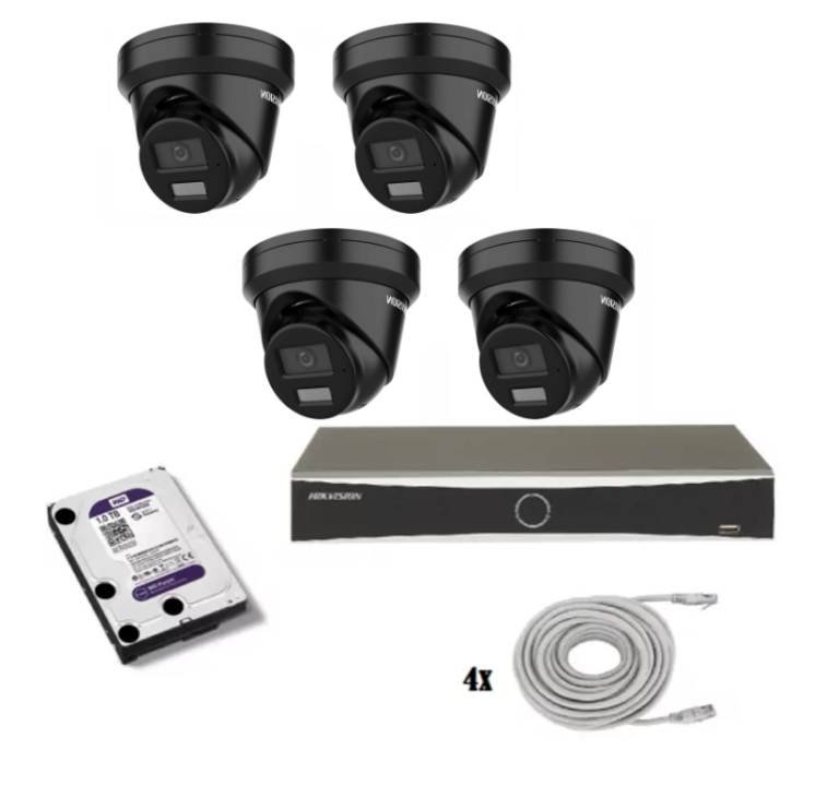 Hikvision beveiligingscamera set met 4 x DS-2CD2346G2H-IU witte turret beveiligingscamera’s met 4 megapixels en een 2.8mm lens, 1 x 4 kanaals Hikvision DS-7604NXI-K1-4P recorder, 1 x harde schijf van 1 TB en netwerkkabels.