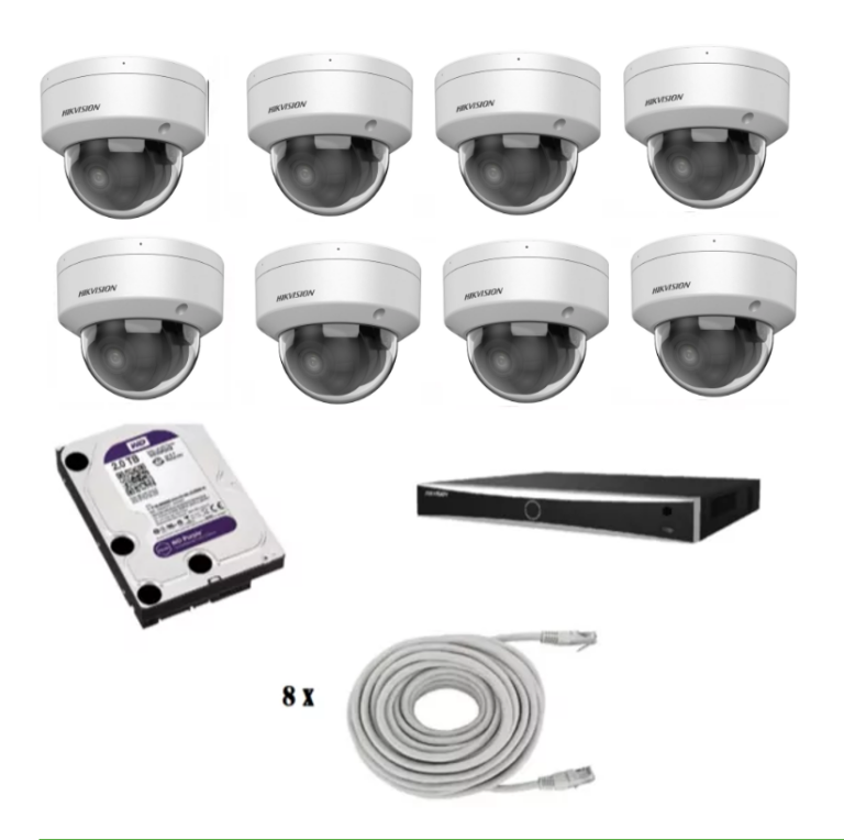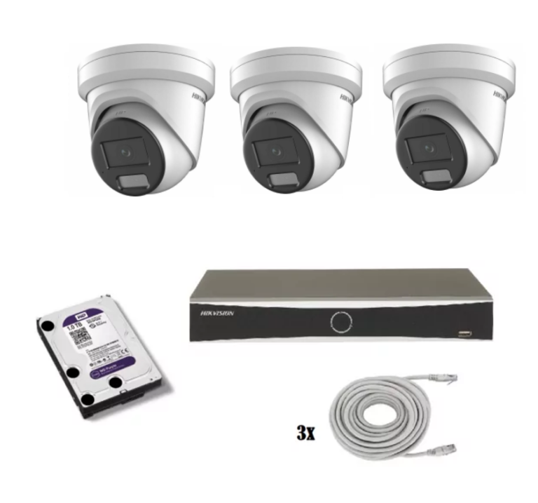 Hikvision beveiligingscamera set met 3 x Hikvision DS-2CD2386G2H-IU turret camera’s met 8 megapixels en een lens van 2.8mm, 1 x 4 kanaals Hikvision DS-7604NXI-K1-4P recorder, 1 x harde schijf van 1 TB en netwerkkabels.